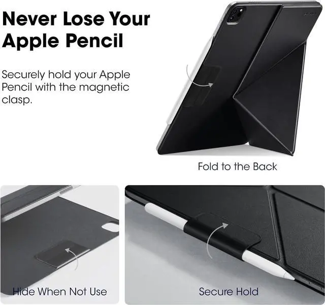 [Magnetic Design & Built-in Pencil Holder] The Powerful magnets hold your tablet firmly. (Note: Magnetic Design - Does Not Cover iPad Edges. ) Use the magnetic clasp to secure your Apple Pencil. Or fold and hide it when not used. You may attach and charge your Apple Pencil 2 as usual.