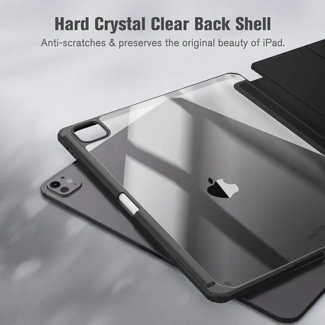 Hardshell back cover with flexible TPU bumper protects your iPad from shocks, drops and impacts. Soft microfiber interior front prevents your tablet from scratched. And the crystal clear back cover will proudly show off the Apple icon.