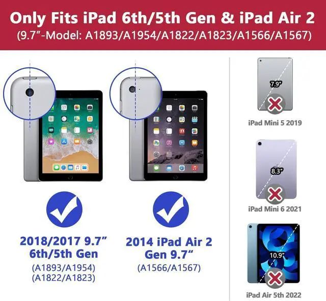 Compatibility: Designed for iPad Air 2 2014(A1566/A1567) / for iPad 6th/5th Generation 9.7 inch 2018/2017(A1893/A1954/A1822/A1823). NOT compatible with any other devices. Please check back bottom of your iPad to find the model number