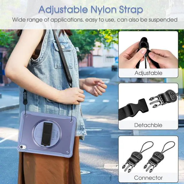 Detachable & Adjustable Should Strap: Come with a detachable & adjustable shoulder strap, let your hands-free, provide more convenience during hiking, traveling, and other outdoor activities. And you can also use it to hang your iPad 10.9 inch in kitchen, car seat or wherever you want for any entertainment