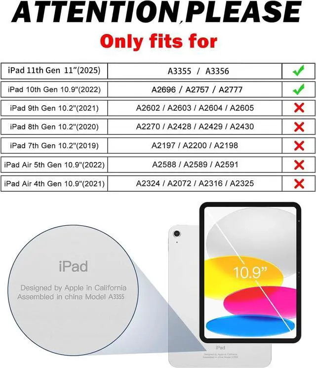 • Compatibility: Lightweight and shockproof case for iPad (A16) 11th Generation 11inch 2025 /10th Generation 10.9 inch 2022 (Model: A3355/ A3356/ A2757/ A2777/ A2696). NOTICE: Apple pencil is NOT included