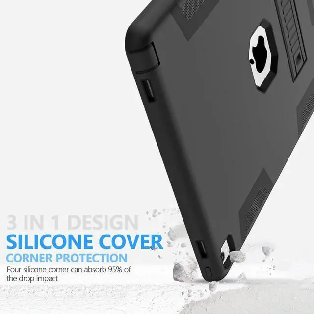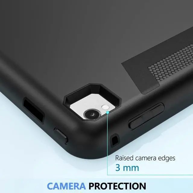 This protective case has an advanced shock-proof design made with 3 layers of hard polycarbonate shell and flexible silicone. The case features a heavy-duty design with raised screen edges and reinforced corners to cushion the impact and protect the tab against bumps, shocks, or scratches.