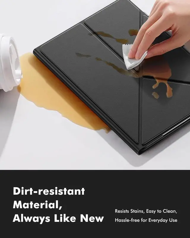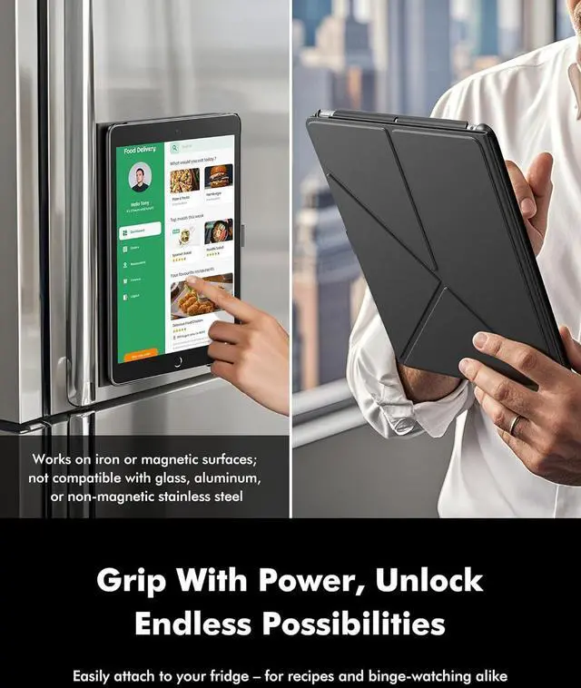 -: The magnetic front cover securely attaches to the back, ensuring it doesnt interfere with the screen. It can also stick to metal surfaces like refrigerators, making it ideal for multitasking or following recipes hands-free. (Note: Works only on iron or iron-containing surfaces, not on glass, aluminum, or non-magnetic stainless steel. )