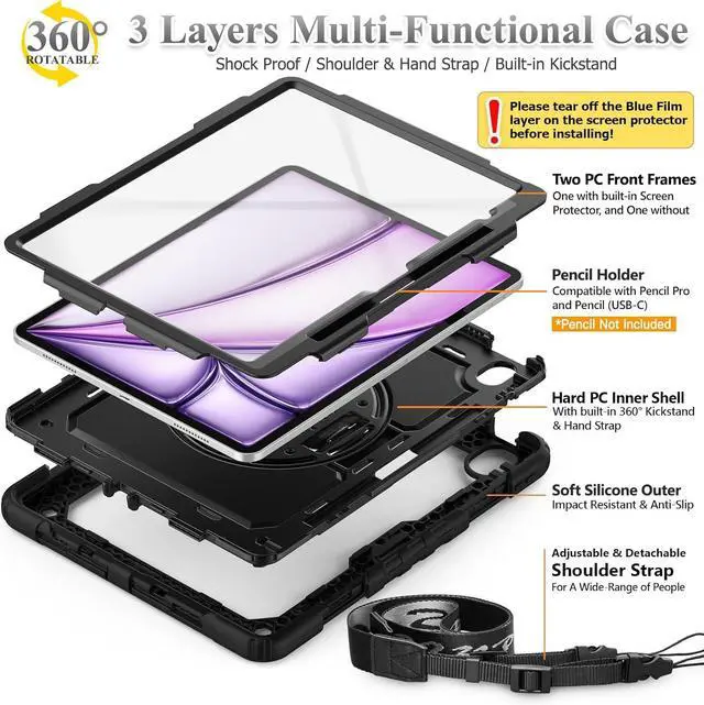 [Adjustable Hand & Shoulder Strap] Hold device comfortably one-handed with soft hand strap for presentations, navigation, document scanning; Adjustable, Detachable shoulder strap for a wide-range of users, carry your device by side and hands-free at all times, case for iPad Air 13 inch M3 M2 suited for business/travel