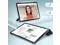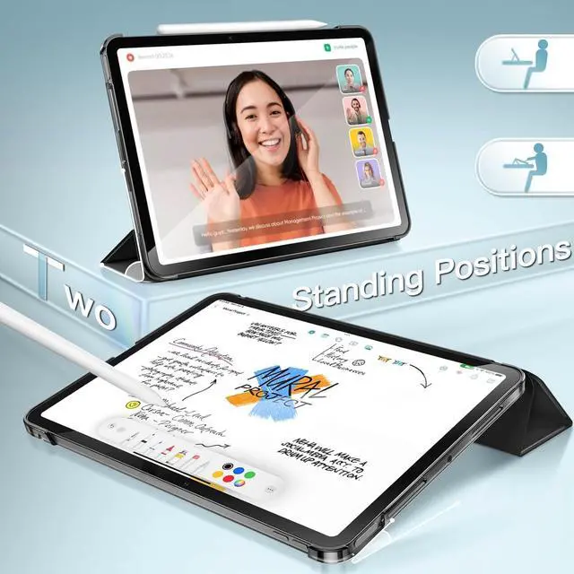 Magnetic smart cover supports automatic sleep/wake function. The tri-fold front cover can support iPad in two standing positions for viewing and typing