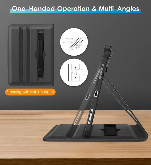 Internal embedded 360-degree rotating design, flexible rotation to any angle for comfortable watching movies or typing. Built-in leather hand strap (one-handed operation)