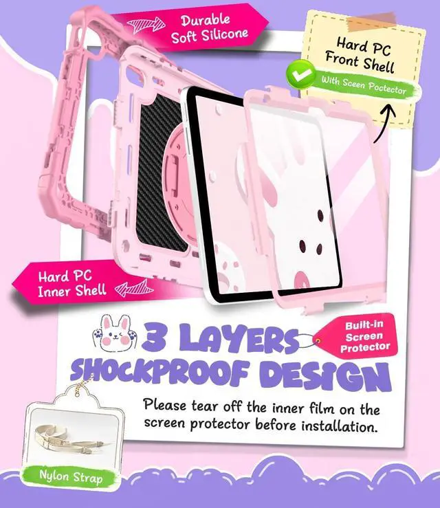 With Screen Protector: This case for iPad 11th generation kids made of durable hard PC & silicone, 3-layer full body protection structure with SCREEN PROTECTOR, provide a military grade protection & anti-scratch.