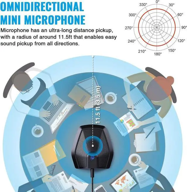 Omnidirectional Microphone - It is not a Speaker or Speakerphone, it is a condenser microphone. The microphone has an omnidirectional pickup pattern with a pickup distance of 11.5 ft, making it easy to capture the most subtle sounds from 360° directions and transmit the sound more loud and clear. Participants can hear each other without raising their voices.