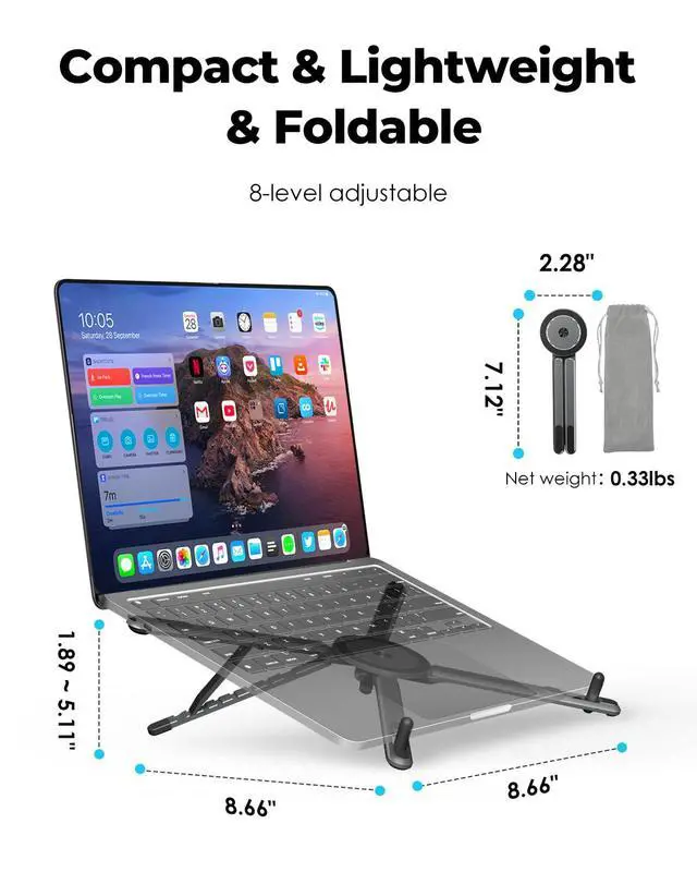 Compact & Travel-Friendly Easy to Carry Anywhere This compact laptop stand folds down to 2.28 × 7.12× 0.73 inches and weighs only 0.33 lbs, making it an ideal travel laptop stand for business trips, study sessions, and vacations. Comes with a velvet storage pouch for scratch-free portability.