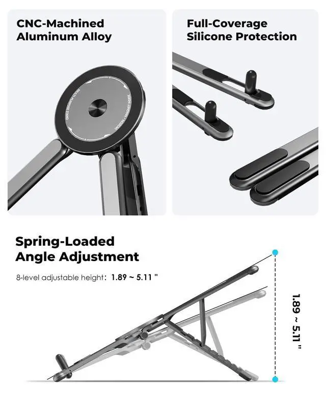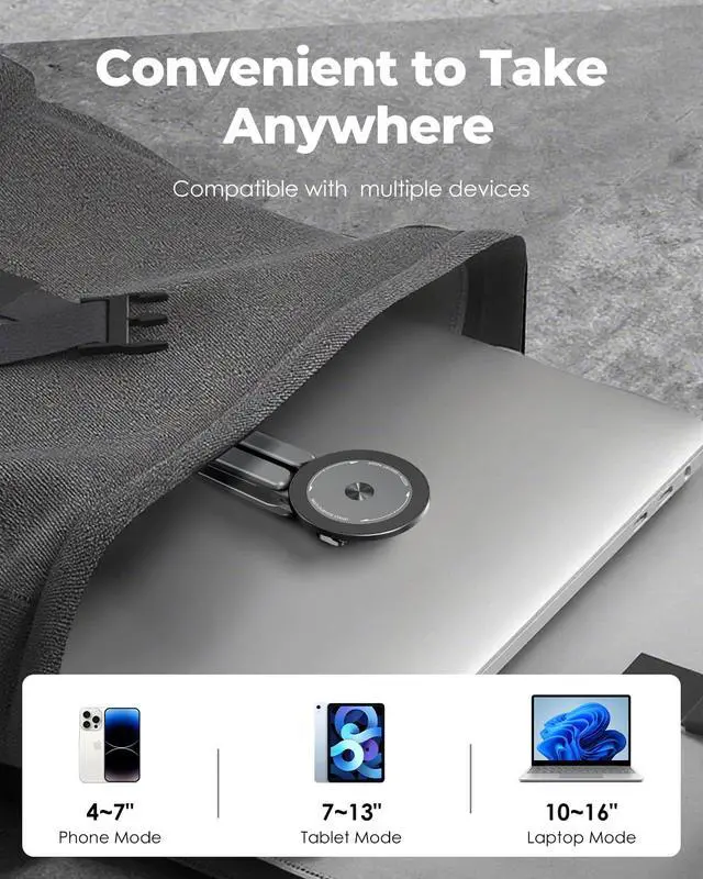 3-Way Multi-Purpose Design Portable Laptop Stand, Phone Holder & Tablet Holder Use it as a foldable laptop stand (compatible with 1016 inch laptops), a desktop magnetic phone stand (fits 413 inch smartphones/tablets), or a hanging magnetic stand for travel on airplanes, buses, or trains. One stand solves your multi-device holding needs anywhere.