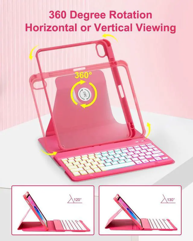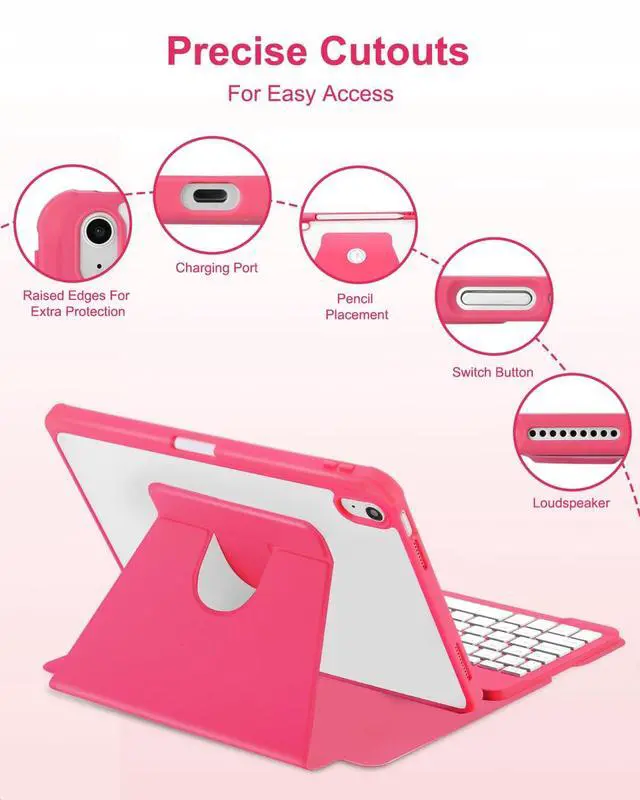 • 7 Colors Rainbow Backlight KeyboardThe RGB rainbow backlight keyboard for iPad 10th generation can provide you with a typing experience in the dark, and the backlight has 7 adjustable colors. These colors can be automatically switched in breathing light mode, and the brightness of the keyboard can be adjusted by pressing Fn+light key. When you don't need the backlight, you can turn it off