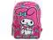 Girls Hello Kitty My Melody 16" Backpack with Rectangular Detachable Insulated Lunch Bag set. Featuring a graphic print of Kuromi. Includes one main zippered compartment, padded, adjustable shoulder straps, and a carry handle. Mesh pockets on the sides hold a water bottle and other items. The insulated, detachable lunch bag is round and features a print of My Melody, attaching with two hook-and-loop straps. The backpack measures approximately 16"H x 12"W x 5"D. The lunch bag measures approximately 9.5" x 3" x 8". Suitable for children ages 3 and up.