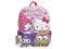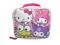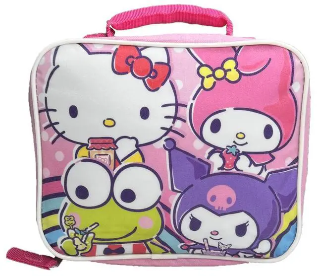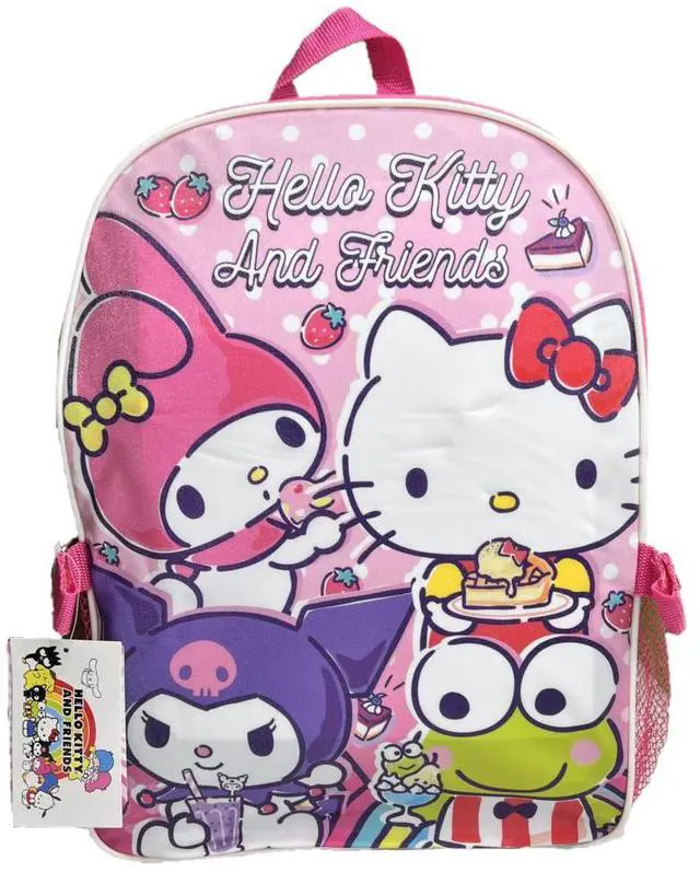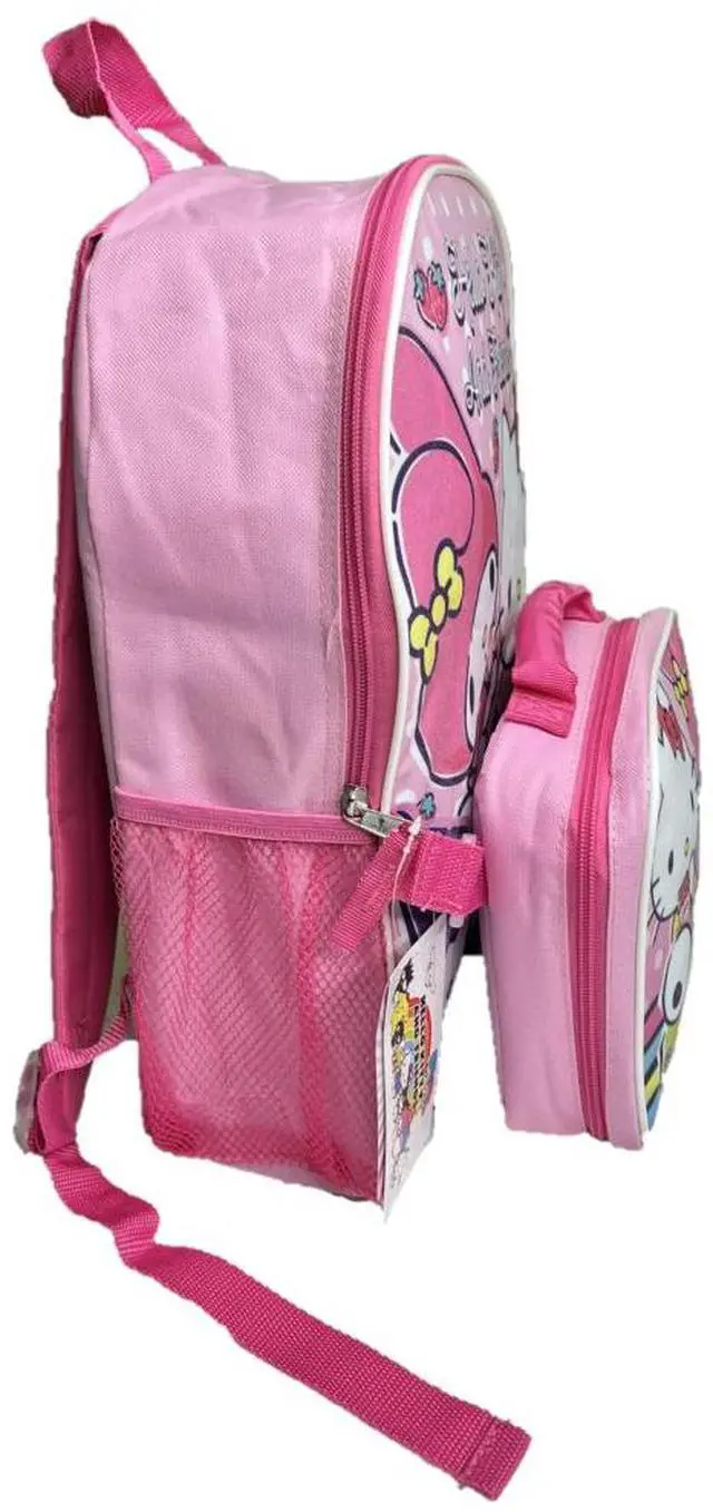 Girls Hello Kitty 16" Backpack with Rectangular Detachable Insulated Lunch Bag set. Featuring a graphic print of Hello Kitty surrounded by her friends. Includes one main zippered compartment and padded, adjustable shoulder straps, along with a carry handle. There are mesh pockets on the sides to hold a water bottle and other items. The insulated, detachable lunch bag is round and features a print of Hello Kitty and friends, attaching with two hook-and-loop straps. The backpack measures approximately 16"H x 12"W x 5"D. The lunch bag measures approximately 9.5" x 3" x 8".