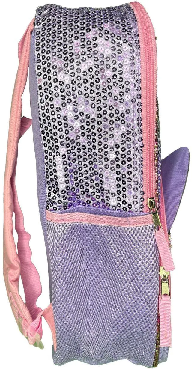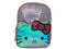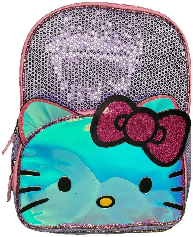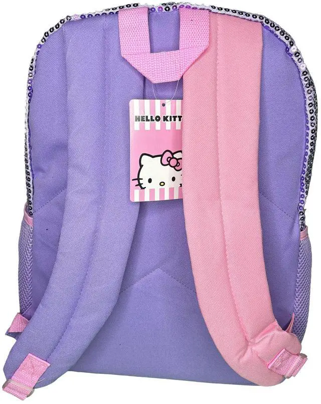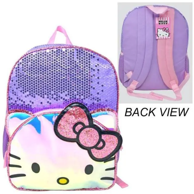 A great Hello Kitty backpack for Sanrio fans! Made of durable material and has adjustable straps for easy and portable transport. Features a large Hello Kitty graphic print. The front has a Hello Kitty pocket head in Holographic plastic that changes color based on the angle you look at it. It has sequins all over the front base in a beautiful purple color. Two side mesh pockets that can carry water bottles or smaller items. Also has one Pink shoulder strap and a purple one.