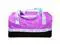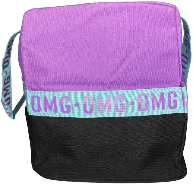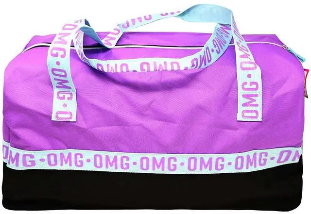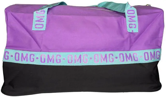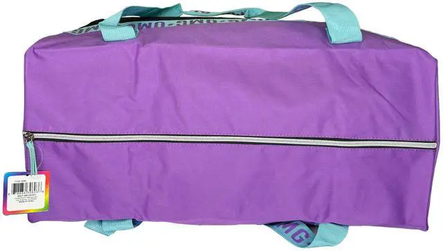 Duffle Bag 300D Poly w/hangtag- Top Purple Bottom Blk, words are Purple with Blue Handles. 100% Polyester. Easy to clean and very durable material. Shoulder straps are not removable or adjustable. Perfect bag for sports or sleepovers. Cute yet essential. Recommended for kids ages 3 and up. Officially Licensed Merchandise.