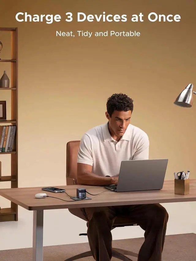 Charge 3 Devices Simultaneously: Smart power allocation, Built-in cable 60W (laptop), USB-C port 20W (phone), USB-A port 15W (earbuds), Ideal for MacBook + iPhone + AirPods Pro combo