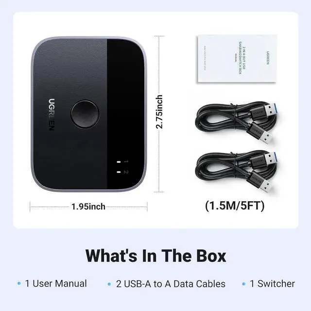 Tip: This is Not a KVM switch and Not support a monitor, USB OUT port only supports data transfer but not video transfer; What's in the box: 1x 2 Port USB 3.0 Switch, 2 x 5 FT USB 3.0 A to A Cable,1*User Manual.