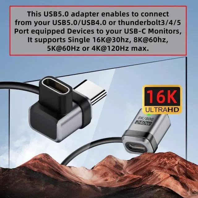 This USB5.0 adapter enables to connect from your USB5.0/USB4.0 or thunderbolt3/4/5 Port equipped Devices to your USB-C Monitors, It supports Single 16K@30hz, 8K@60hz, 5K@60Hz or 4K@120Hz max. video Resolution in your external displays.(please make sure your monitor's Type-c port support DP Alternate Mode for Video.)