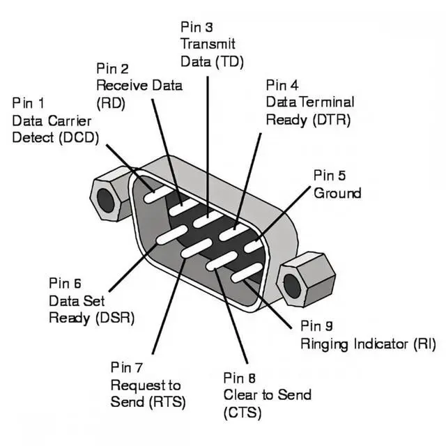 RS232 DB 9pin male with thumberscrews; RS232 DB 9pin female with screw nuts.