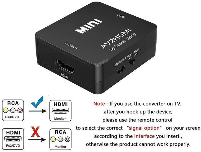 This RCA, CVBS, AV composite to HDMI converter, is a universal converter for analog composite input to HDMI 720p or 1080p (60Hz) output. You will be able to use your VCR, camcorder, or old game system display on your HDTV or HDMI monitor. This converter's advanced processing allowing you to get the clearest picture quality possible with optimal color and detail reproduction. Both video and audio are integrated into the HDMI output, providing an all-digital signal to maximize the fidelity of the audio and video.