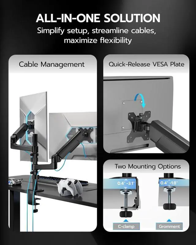 Integrated Cable Management - Maximize your desk space with a dual-monitor mount featuring built-in cable management that hides wires, creating a clutter-free gaming setup.