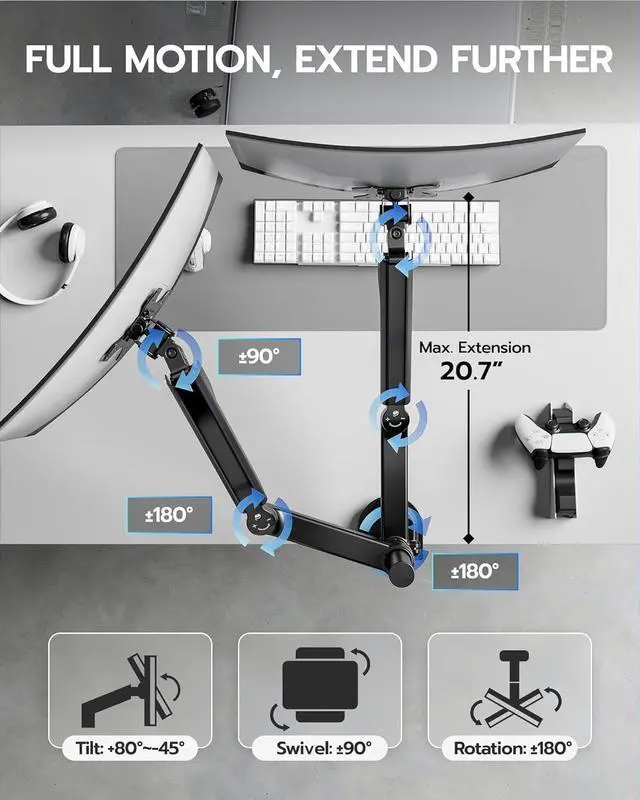 Extended Column - The ultrawide monitor arm features an 16" extended column, Customize your setup with 25" height adjustment, 20.7" extension range, ±180° swivel, 360° rotation, and +90°/-90° tilt. Achieve eye-level alignment effortlessly.