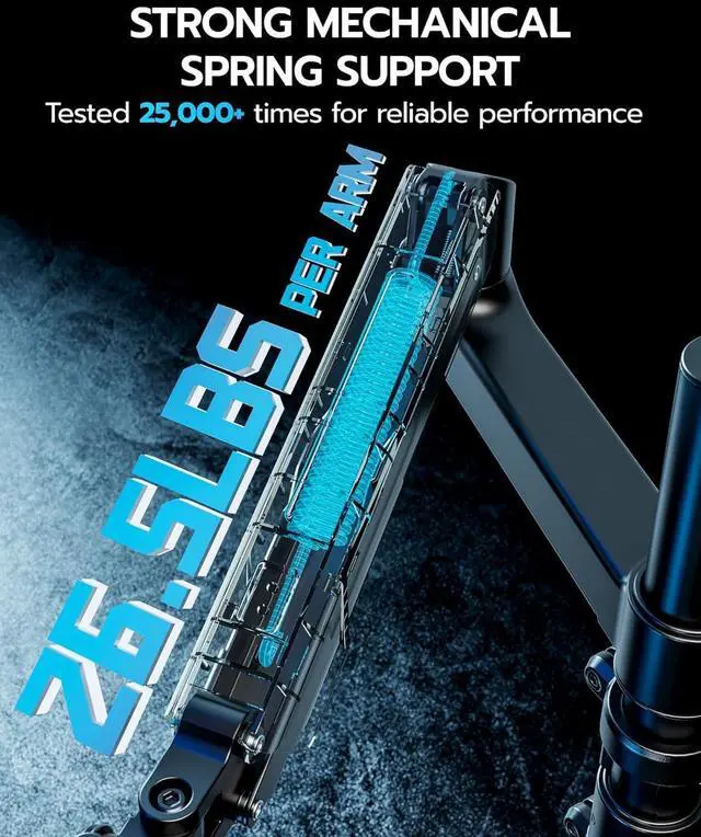 Durability and Strength - Ares Wing dual Monitor arms supports up to 26.5 lbs and fits 17-35 inch ultrawide curved screens displays, ideal for gaming setup and office workstation. Its internal mechanical spring undergoes 25,000+ fatigue tests, ensuring long-lasting stability for heavy-duty use.