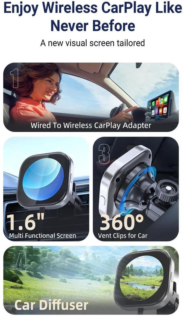 Unique 2-in-1 Car Connectivity & Wellness Design: This is the world's first CarPlay adapter that combines seamless wireless smartphone connectivity with an integrated in-car aromatherapy system. It upgrades your tech and your cabin environment simultaneously.