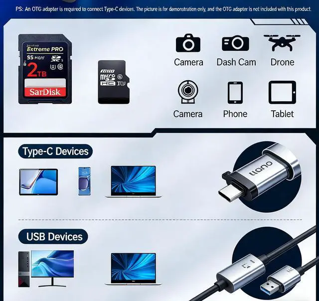 High-Speed USB 3.0 & Type-C Dual Connectivity: Features both a standard USB 3.0-A port and a modern USB Type-C port on the same device. This ensures universal compatibility with virtually any computer, laptop, tablet, or smartphone (with OTG support), offering maximum flexibility and future-proofing.