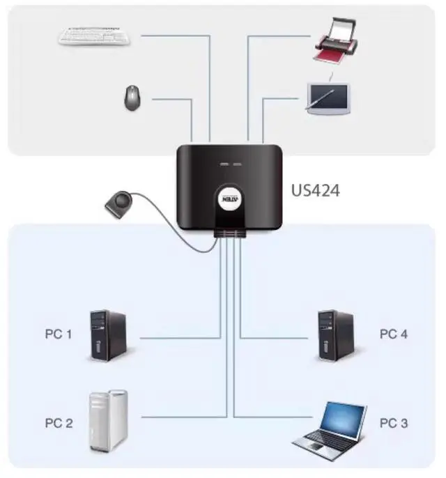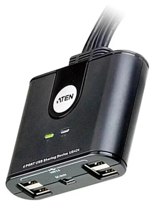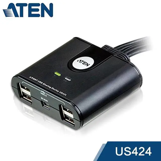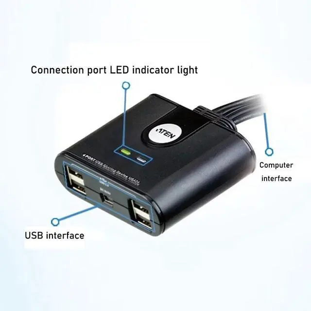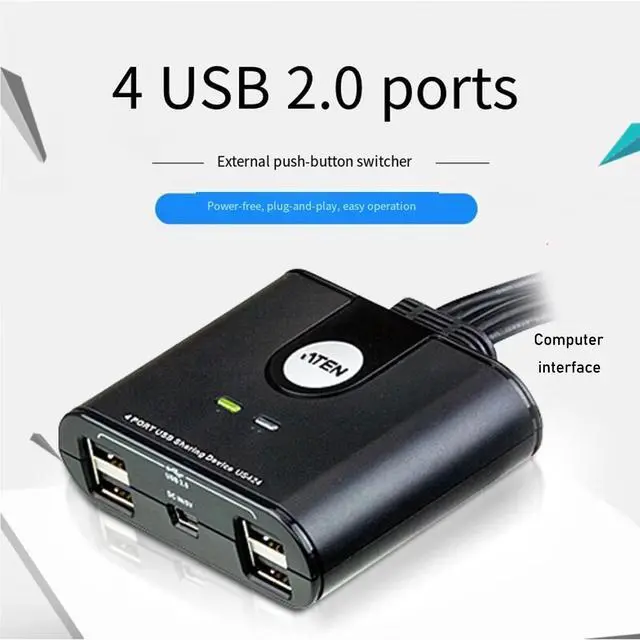 It is equipped with 4 USB connection ports - the integrated design simplifies the installation process and eliminates the clutter of cables.It enables four computers to share four USB devices- one set ofkeyboards, mice and two other USB peripheral devices.You can easily operate by using an external switch button. Select the computer that willbe used for the USB device you want.Compatible with USB 2.0Cross-platform support- Windows, Linux, Mac and Sun systemsThe LED indicator light shows the operating status of the computer.Overcurrent protection