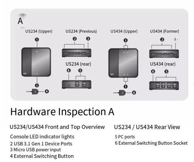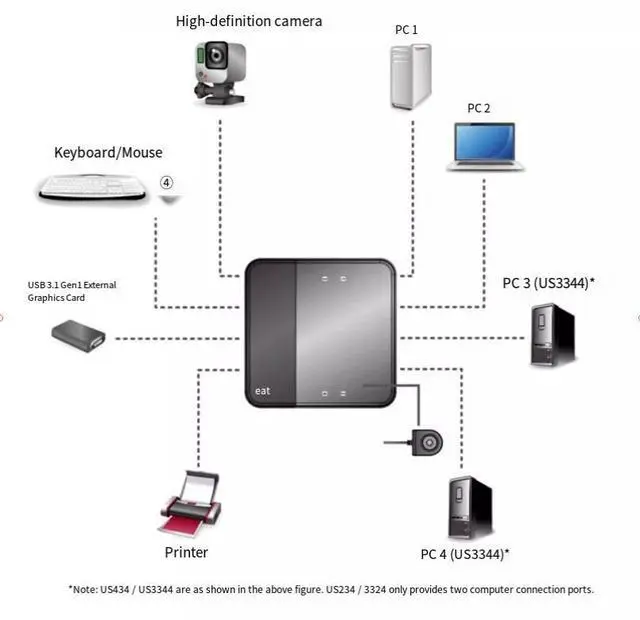 ,By using the external switch button, you can easily select the computer thatiscompatible with the USB device you want to use. The USB 3.1 Gen 1 standard is ' supported, with a maximum transmission rate of up to 5Gbps.