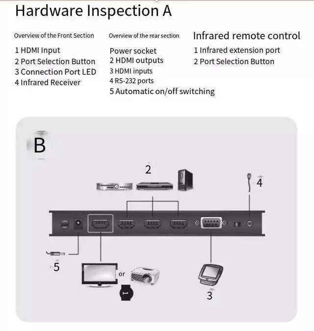 Using the VS481C HDMl switcher, you can easily and flexibly select the input source device invarious ways, including front panel buttons,infrared remote control, and RS-232 commands.