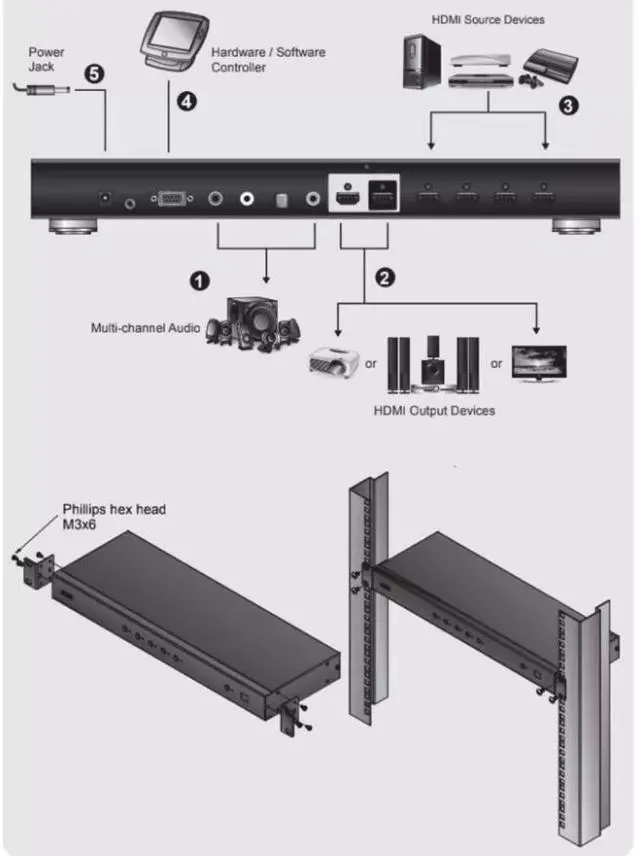 If you need to install the switcher,please referto the installation diagram and follow the steps below:Connect the audio equipment (such as speakers or AVR [Audio Video Receiver]) to the stereo audio output port or the digital audio output port.