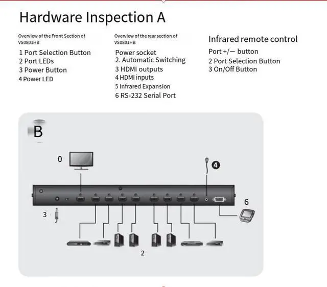 Using the VS0801 HB8 port HDMl switcher, you can easily and flexibly select the input source devicein various ways, including front panel buttons, remote control, or via the RS-232 serial interface.