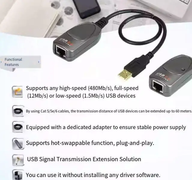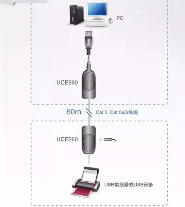 By using Cat 5/5e/6 cables, the transmission distance of USB devices can be extended up to 60 meters.