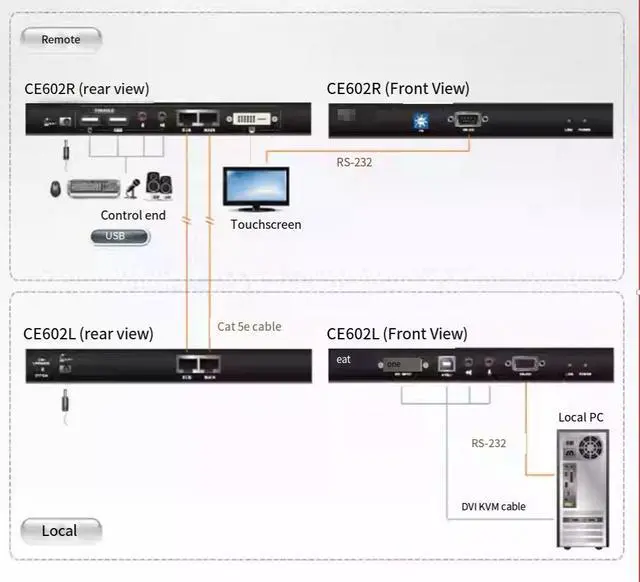 Connect local and remote devices via Cat 5e cables,with a maximum distance of 60 meters.It can be accessed from a group of remote control terminals (up to 60 meters away) to the computer or KVM deviceSupports DVl-D interface and transmits DVI Dual Link signalsEquipped with ATEN's advanced technology,audio and video signals can be transmitted through asingle Cat 5e cable.Transmit HDCP, RS-232, microphone and Dual Link signals via the second Cat 5e cable.