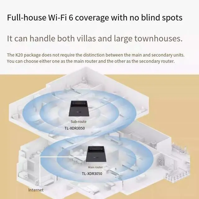 One main routercan support up to 7 sub-routers for MESH networking.Whetherit'sacomplexfloor plan,a large flat,avilla,or asingle-familyhouse, simply add sub-routers in areas without signal based on theactual situation, and with a singleclickof "Easy Expansion",thenetworking can be completed.