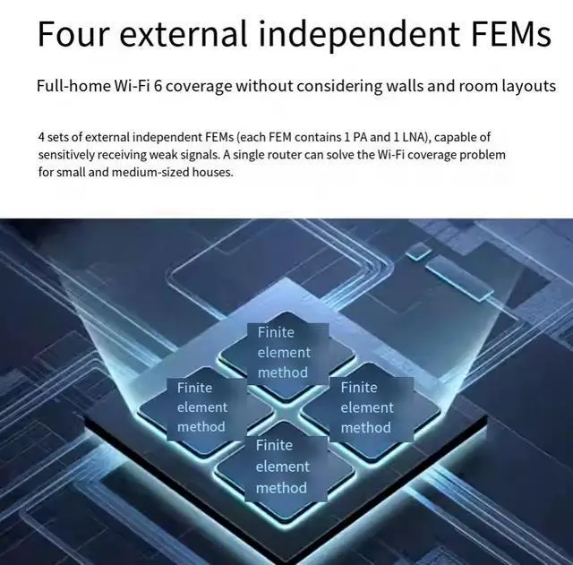 4 sets of external independent FEMs (each FEM contains 1 PA and 1 LNA). Even for weaksignals, they can receive data sensitively. With a single router, it can solve the Wi-Ficoverage problem for small and medium-sized houses.