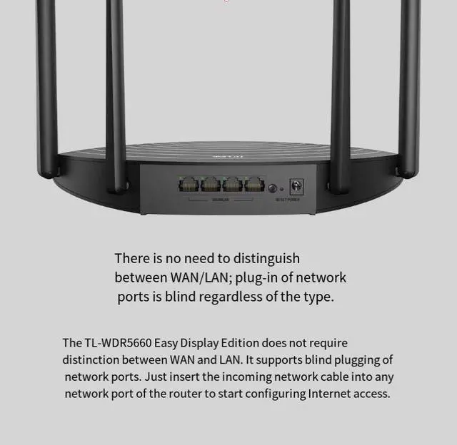The TL-WDR5660 Expandable Version supports dual-band concurrentoperation and offers a 1167Mbps high-speed Wi-Fi. It adopts the VxWorksreal-time operating system, ensuring high reliability. For mobile internetaccess, applications such as WeChat, QQ, short videos, and mobile gameshave low latency and fast speeds. It enhances the router's own internal andexternal network's anti-attack capabilities,ensuring the Wi-Fi operatesstably, safely, and at high speed for a long time.