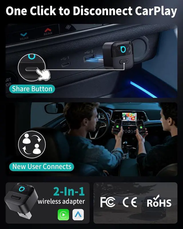 • One-Tap Disconnect No Need to UnplugDeveloped from feedback from thousands of drivers, the Ottocast wireless CarPlay adapter features a one-tap button that instantly ends CarPlay and allows seamless driver switching no unplugging required.