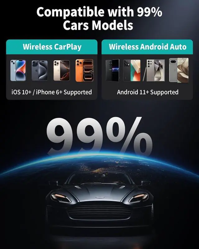 • Compatibility Check Is It Right for My Car?The Ottocast wireless CarPlay adapter is designed exclusively to convert existing wired CarPlay or Android Auto systems to wireless.Compatible with iPhone (iOS 10+) and Android (Android 11+) devices. Works only with vehicles equipped with a touchscreen display.(Tip: Checking compatibility before purchase ensures the best user experience.)