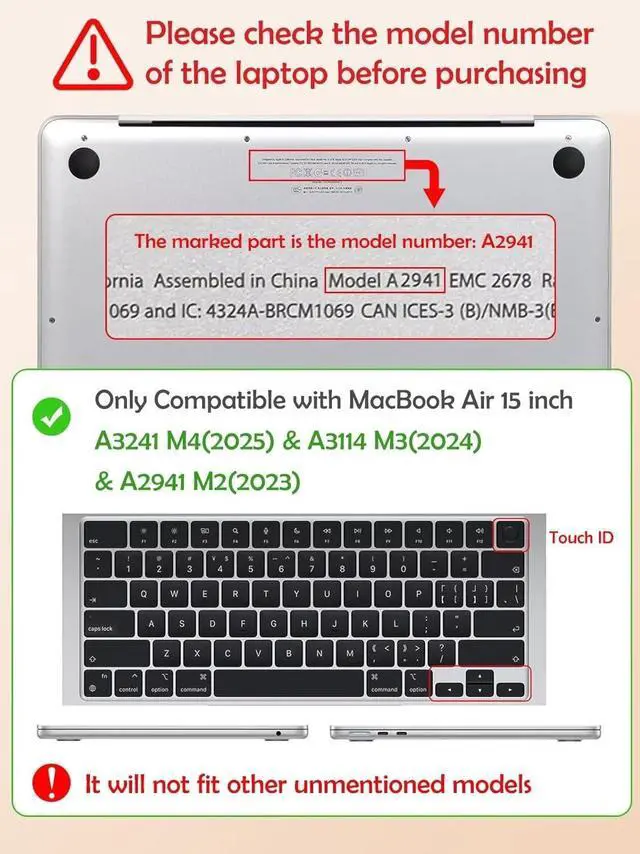 Please carefully choose the correct size option, make sure the model number Axxxx is just the same as yours, you can find your model number Axxxx on the back of the laptop. ONLY COMPATIBLE WITH MacBook Air 15 inch with M2 M3 Chip & Liquid Retina Display & Touch ID (2023 2024 Release)