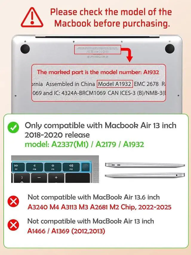 Please carefully choose the correct size option, make sure the model number Axxxx is just the same as yours, you can find your model number Axxxx on the back of the laptop. ONLY COMPATIBLE WITH 2018 2019 2020 2021 New Release Air 13.3 inch with Retina Display and Touch ID. Model Number A2337 (M1), A2179, A1932NOT FIT 2022-2025 Air 13.6 inch M2 M3 M4 Chip Model A2681 A3113 A3240Old Version Air 13 inch 2009-2017 release Model A1466 A1369. Fancity Air 13 inch case is made of hard plastic and is rubber coated, smooth touch feeling and can protect your Air 13.3 inch from Shock and Dust, while keeping it in style.