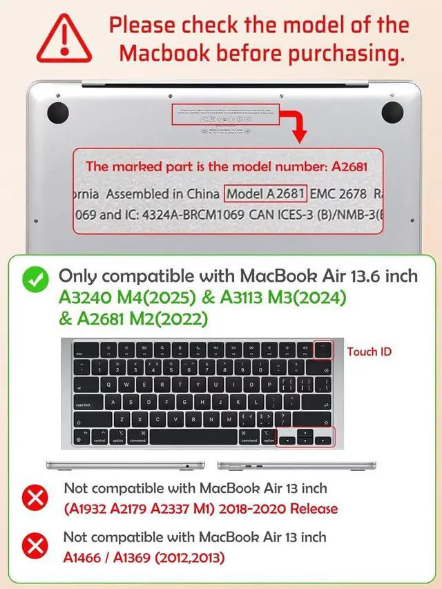 Please carefully choose the correct size option, make sure the model number Axxxx is just the same as yours, you can find your model number Axxxx on the back of the laptop. ONLY COMPATIBLE WITH MacBook Air 13.6 inch M3 M2 Chip with Liquid Retina Display & Touch ID 2022 2023 2024 Release. Model Number A3113 (M3) & A2681 (M2) NOT FIT previous macbook Air 13.3 -inch M1 chip