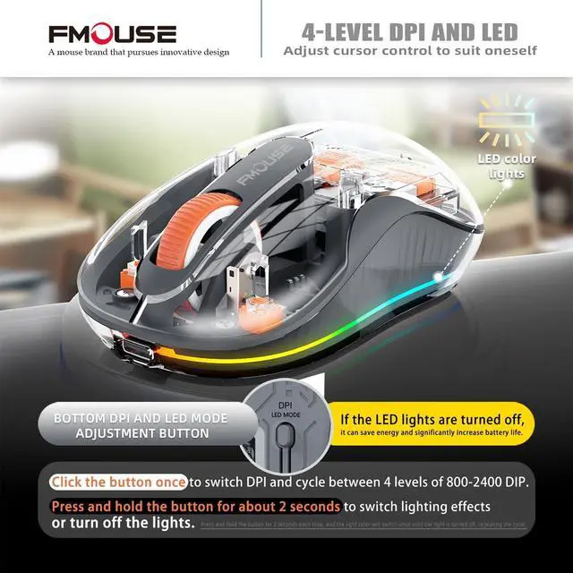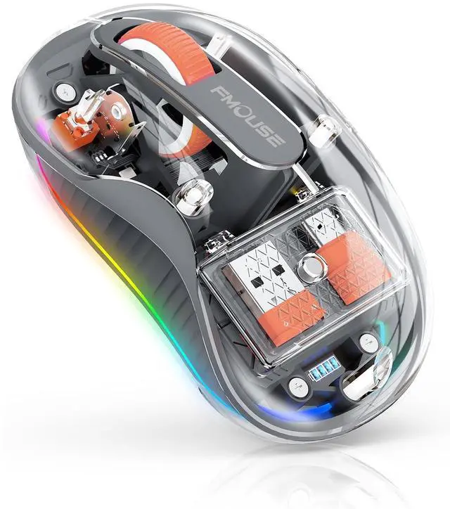 ^^ Rechargeable RGB Mouse: With a Type-C port for quick charging and an indicator to show remaining battery. Transparent shell with cool LED light ring, stunning at night. RGB lights are on when it stops, and off when it moves. Press bottom button to turn off lights and extend battery life.
