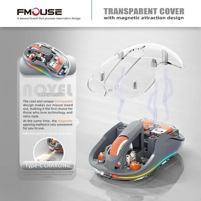Discover our newly trendy wireless Bluetooth mouse! Its see-through magnetic shell is truly unique. Compact and portable, this exquisitely designed mouse not only looks great but also packs powerful functions, designed to enhance your daily and working use. ^^ Tri-mode Multi-device USB-C port