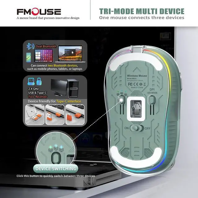 Discover our newly trendy wireless Bluetooth mouse! Its see-through magnetic shell is truly unique. Compact and portable, this exquisitely designed mouse not only looks great but also packs powerful functions, designed to enhance your daily and working use. ^^ Tri-mode Multi-device USB-C port