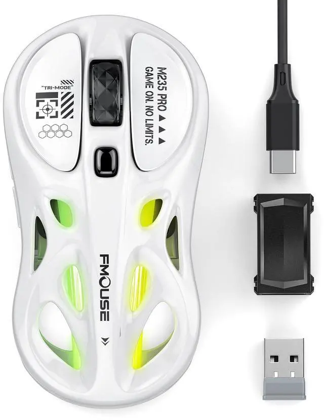 FMOUSE White Gaming Mouse - Tri-Mode Wireless (2.4G/Bluetooth/Wired), Ergonomic Hollow Design, RGB Backlight, Side Buttons, Rechargeable Type-C for Mac/Laptop/iPad (Gaming/Office)