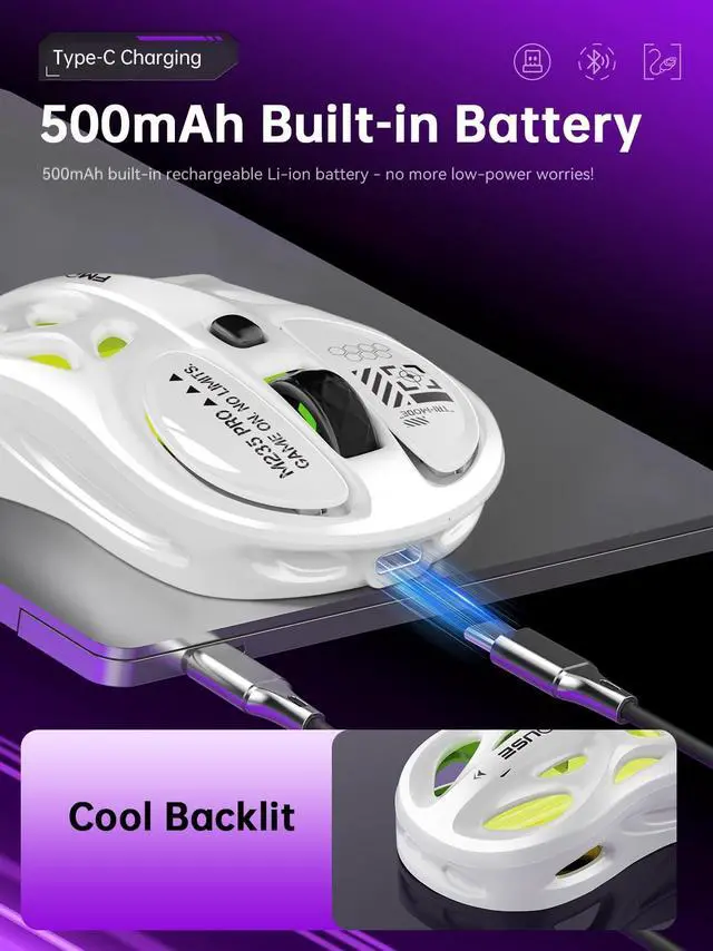The 500mAh rechargeable battery, paired with Type-C charging, delivers robust battery life, eliminating the need for frequent recharging. ^^ Customizable RGB & Buttons Multiple vibrant RGB backlight modes to light up your desktop at night. Support custom buttons and macro programming, allowing you to create a personalized mouse for unique needs. ^^ Wide System Compatibility Fully works with Windows, Mac, and Android systems. Perfectly supports laptops, iPads, MacBooks, and more, making it a versatile choice for home, office, and gaming setups.
