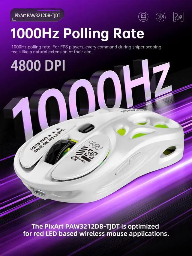 True Tri-Mode & 3-Device Switch Effortlessly connect via 2.4G USB receiver, dual Bluetooth, or wired Type-C. Seamlessly switch between 3 devices (Mac/Laptop/iPad/Android) for smooth gaming, office work, or daily use. ^^ Gaming-Grade Performance Equipped with the PixArt PAW3212DB-TJDT chip, featuring an ultra-low latency 1000Hz polling rate and 5 adjustable DPI levels (up to 4800). It delivers precise, quick responses to handle both intense gaming battles and precise office tasks. ^^ Ergonomic Comfort & Long-Lasting Battery Its unique hollow design ( 4.7 x 2.4 x 1.3 inches) reduces hand fatigue during extended use.